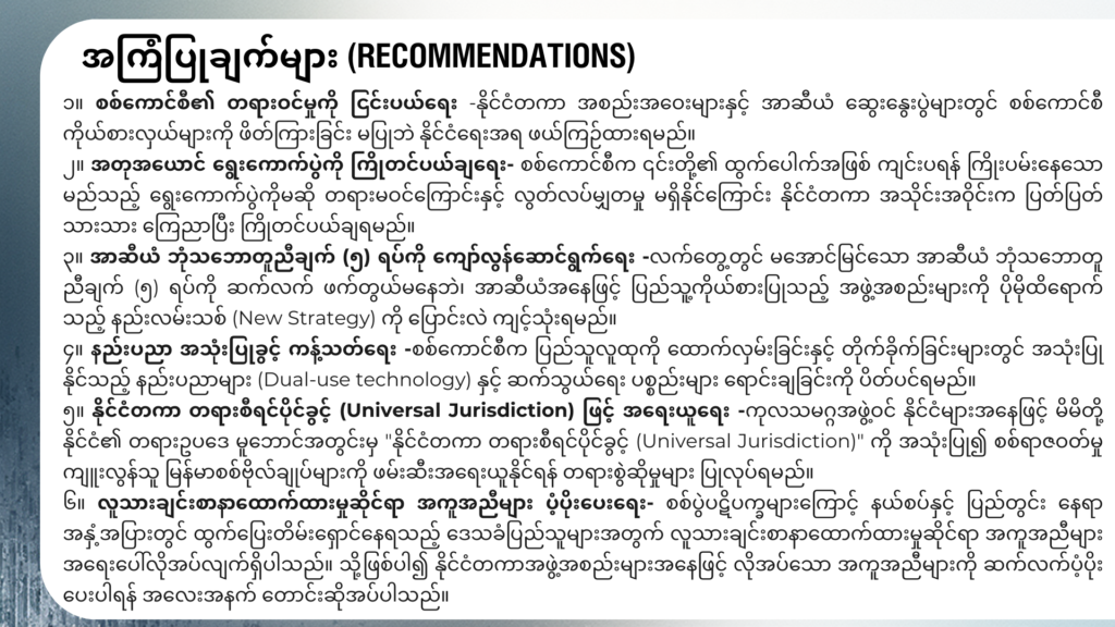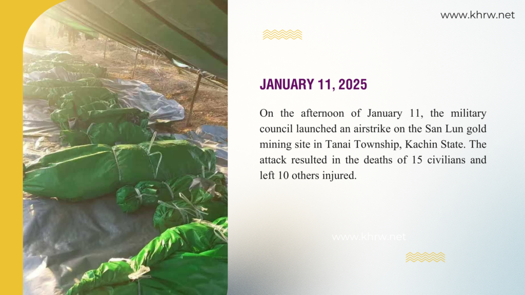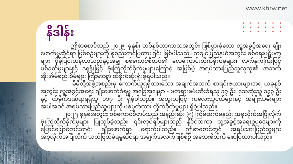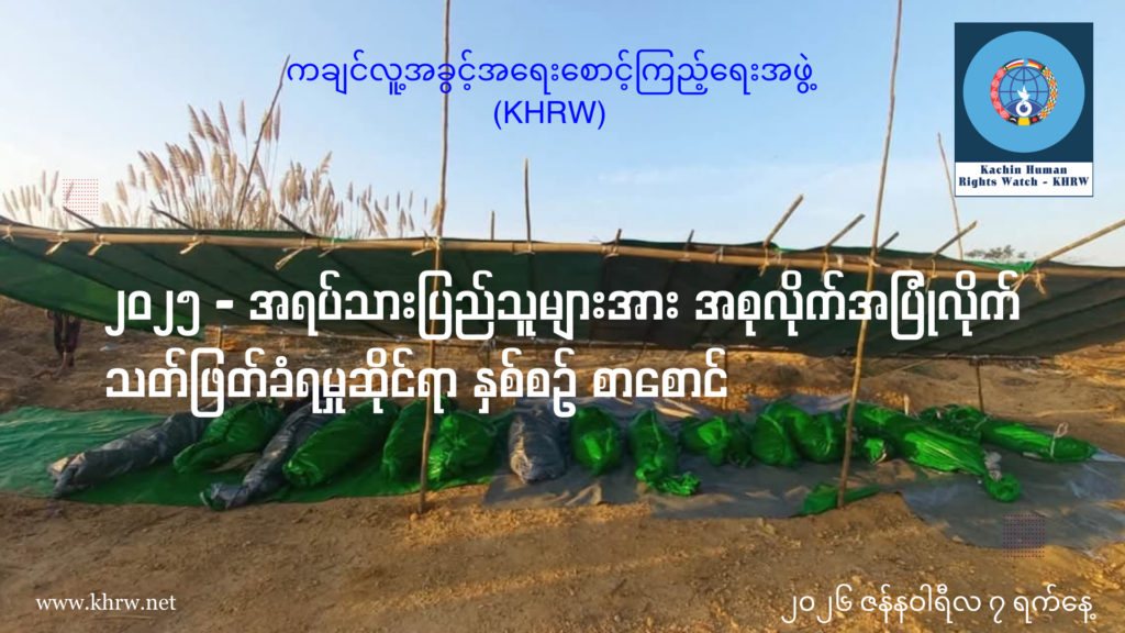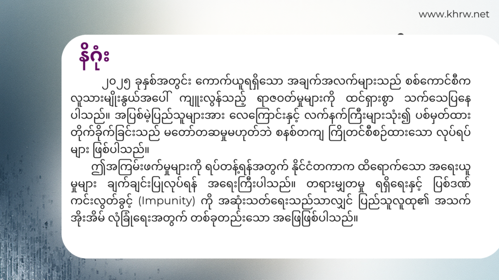 ဤစာစောင်သည် ၂၀၂၅ ခုနှစ်၊ တစ်နှစ်တာကာလအတွင်း ဖြစ်ပွားခဲ့သော လူ့အခွင့်အရေး ချိုးဖောက်မှုဆိုင်ရာ ဖြစ်စဉ်များကို စုစည်းတင်ပြထားခြင်း ဖြစ်ပါသည်။ ကချင်ပြည်နယ်အတွင်း စစ်ရေးပဋိပက္ခများ ပိုမိုပြင်းထန်လာသည်နှင့်အမျှ စစ်ကောင်စီတပ်၏ လေကြောင်းတိုက်ခိုက်မှုများ၊ လက်နက်ကြီးဖြင့် ပစ်ခတ်မှုများနှင့် ဒရုန်းဖြင့် ဗုံးကြဲတိုက်ခိုက်မှုများကြောင့် အပြစ်မဲ့ အရပ်သားပြည်သူလူထု၏ အသက်အိုးအိမ်စည်းစိမ်များ ကြီးမားစွာ ထိခိုက်ဆုံးရှုံးခဲ့ရပါသည်။
