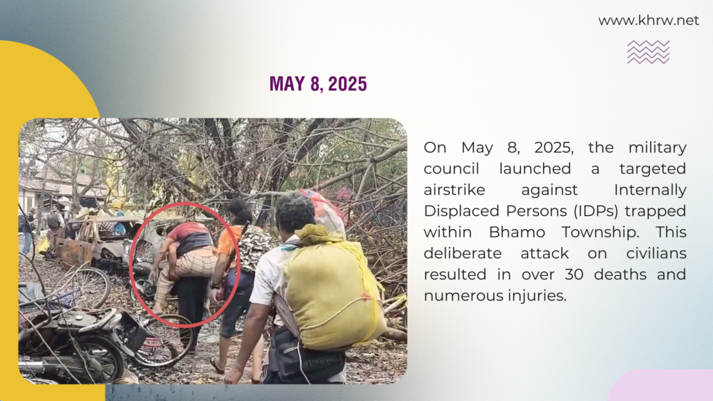 ၂၀၂၅ ခုနှစ်အတွင်း စစ်ကောင်စီတပ်သည် အနည်းဆုံး (၅) ကြိမ်ထက်မနည်း အစုလိုက်အပြုံလိုက် ဗုံးကြဲတိုက်ခိုက်မှုများ ပြုလုပ်ခဲ့သည်။ ၎င်းလုပ်ရပ်များသည် နိုင်ငံတကာ လူ့အခွင့်အရေးဥပဒေများကို ပြောင်ပြောင်တင်းတင်း ချိုးဖောက်ရာ ရောက်ပါသည်။ ဤစာစောင်တွင် အရပ်သားပြည်သူများ အစုလိုက်အပြုံလိုက် သတ်ဖြတ်ခံရမှုဆိုင်ရာ အချက်အလက်ဖြစ်စဉ် အသေးစိတ်ကို ဖော်ပြထားပါသည်။