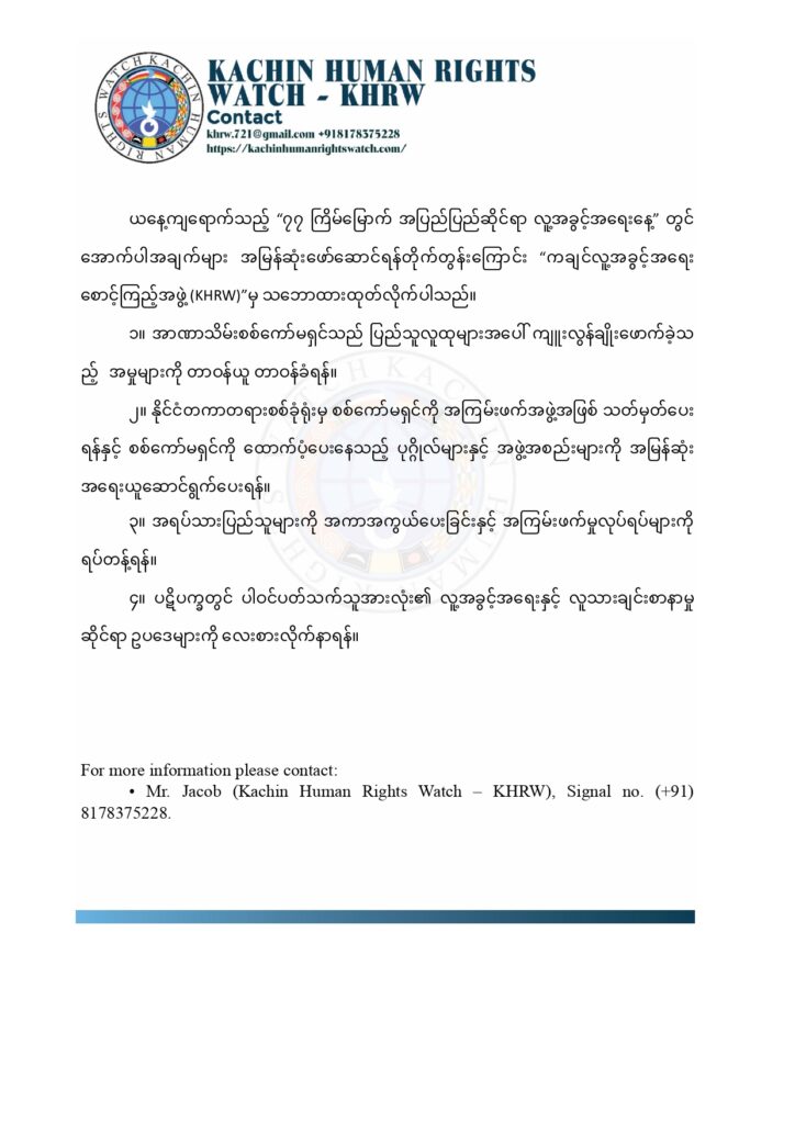 ယနေ့ကျရောက်သည့် “၇၇ ကြိမ်မြောက် အပြည်ပြည်ဆိုင်ရာ လူ့အခွင့်အရေးနေ့” တွင် အောက်ပါအချက်များ အမြန်ဆုံးဖော်ဆောင်ရန်တိုက်တွန်းကြောင်း “ကချင်လူ့အခွင့်အရေး စောင့်ကြည့်အဖွဲ့ (KHRW)”မှ သဘောထားထုတ်လိုက်ပါသည်။