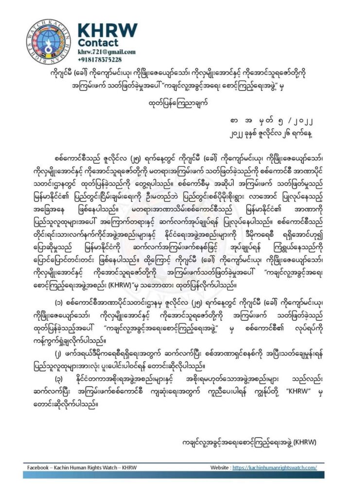 ကိုဂျင်မီ (ခေါ်) ကိုကျော်မင်းယု၊ ကိုဖြိုးဇေယျော်သော်၊ ကိုလှမျိုးအောင်နှင့် ကိုအောင်သူရဇော်တို့ကို အကြမ်းဖက် သတ်ဖြတ်ခဲ့မှုအပေါ် “ကချင်လူ့အခွင့်အရေး စောင့်ကြည့်ရေးအဖွဲ့” မှ