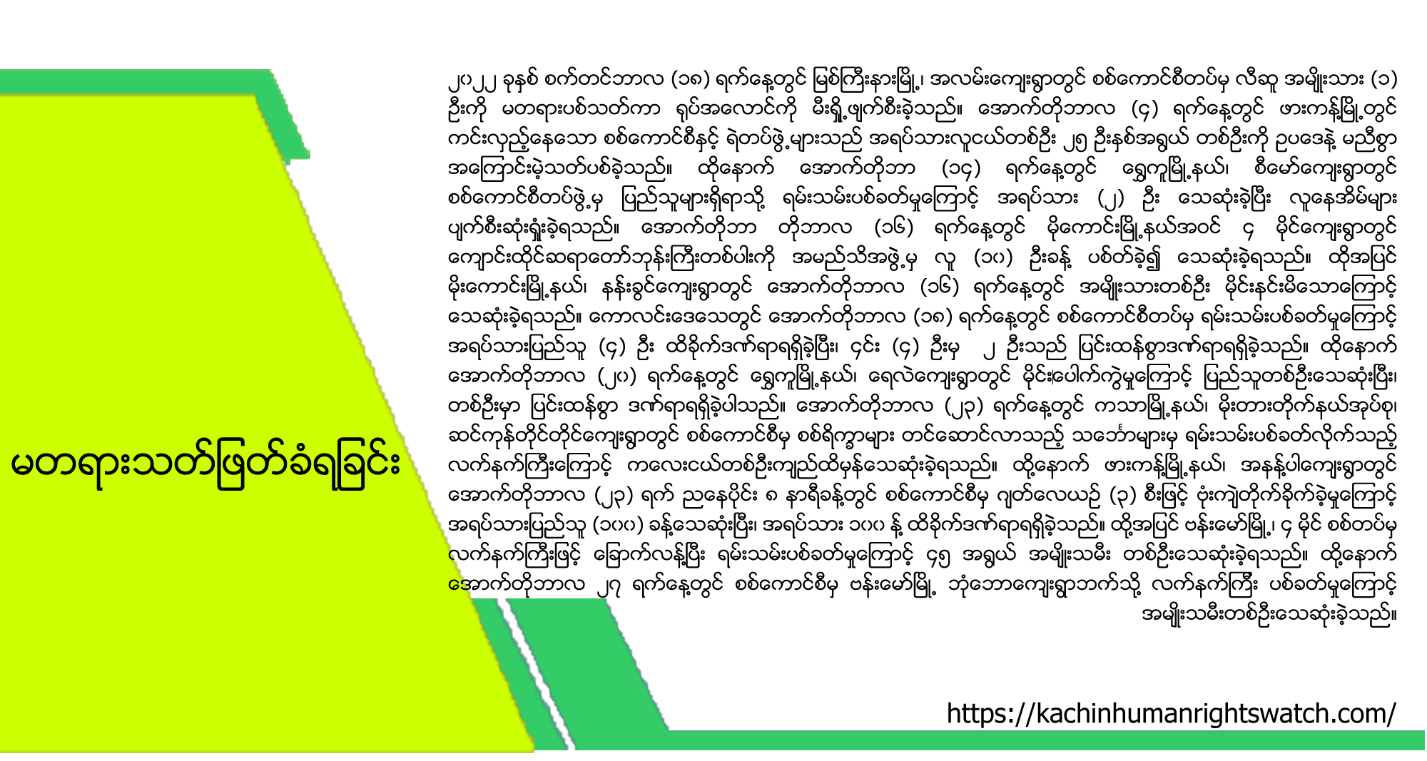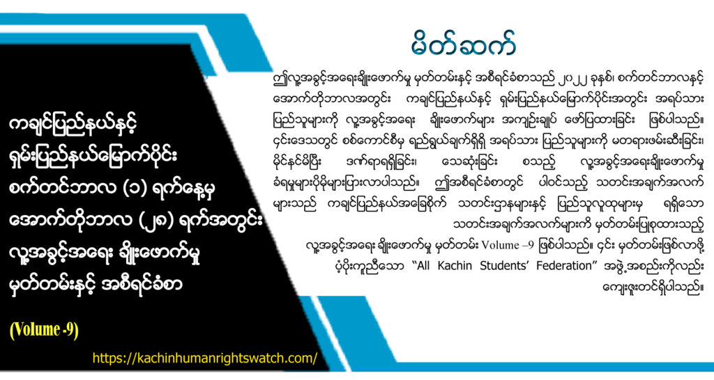 ကချင်ပြည်နယ်နှင့် ရှမ်းပြည်နယ်မြောက်ပိုင်း စက်တင်ဘာလ (၁) ရက်နေ့မှ အောက်တိုဘာလ (၂၈) ရက်နေ့အတွင်း လူ့အခွင့်အရေးချိုးဖောက်မှု မှတ်တမ်းနှင့် အစီရင်ခံစာ