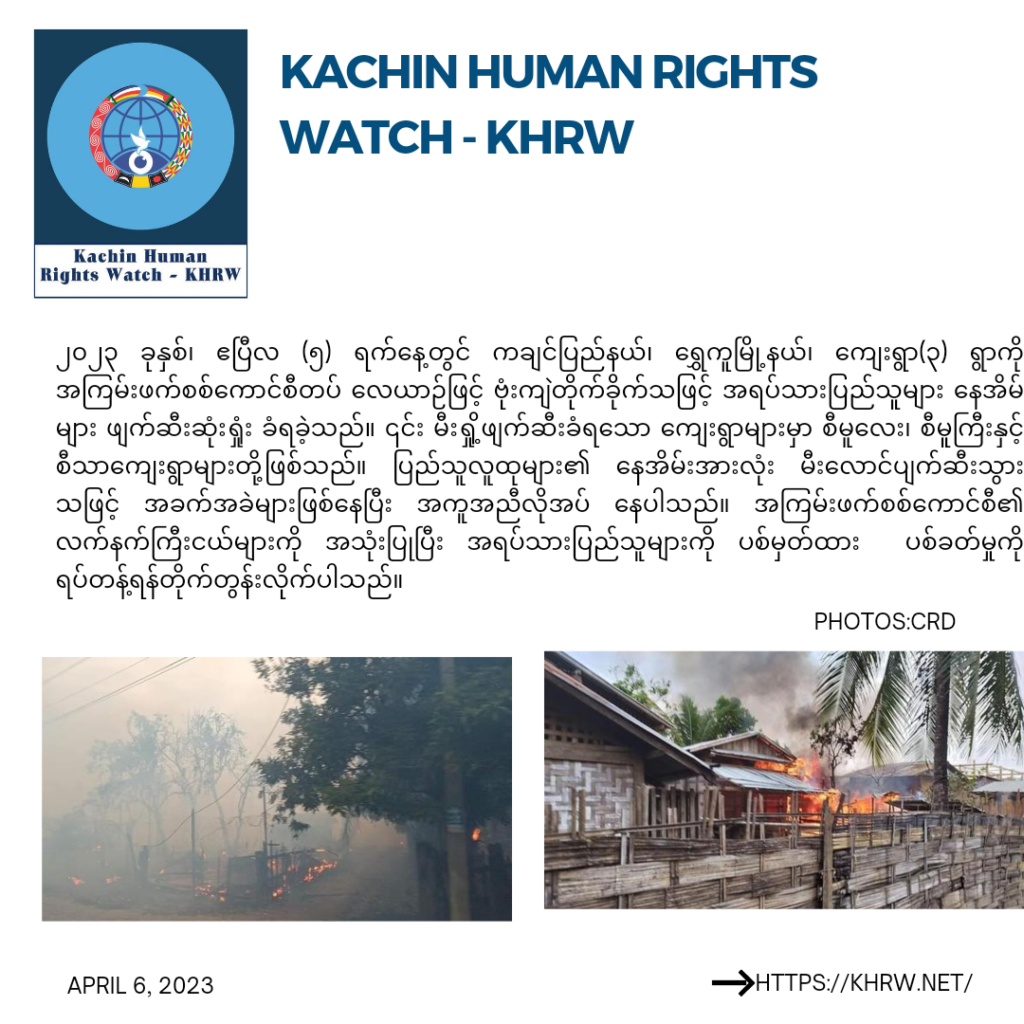 ၂၀၂၃ ခုနှစ်၊ ဧပြီလ (၅) ရက်နေ့တွင် ကချင်ပြည်နယ်၊ ရွှေကူမြို့နယ်၊ ကျေးရွာ(၃) ရွာကို အကြမ်းဖက်စစ်ကောင်စီတပ် လေယာဉ်ဖြင့် ဗုံးကျဲတိုက်ခိုက်သဖြင့် အရပ်သားပြည်သူများ နေအိမ်များ ဖျက်ဆီးဆုံးရှုံး ခံရခဲ့သည်။ ၎င်း မီးရှို့ဖျက်ဆီးခံရသော ကျေးရွာများမှာ စီမူလေး၊ စီမူကြီးနှင့် စီသာကျေးရွာများတို့ဖြစ်သည်။ ပြည်သူလူထုများ၏ နေအိမ်းအားလုံး မီးလောင်ပျက်ဆီးသွားသဖြင့် အခက်အခဲများဖြစ်နေပြီး အကူအညီလိုအပ် နေပါသည်။ အကြမ်းဖက်စစ်ကောင်စီ၏ လက်နက်ကြီးငယ်များအသုံးပြုပြီး အရပ်သားပြည်သူများကို ပစ်မှတ်ထားပစ်ခတ်မှုကို ရပ်တန့်ရန်တိုက်တွန်းလိုက်ပါသည်။