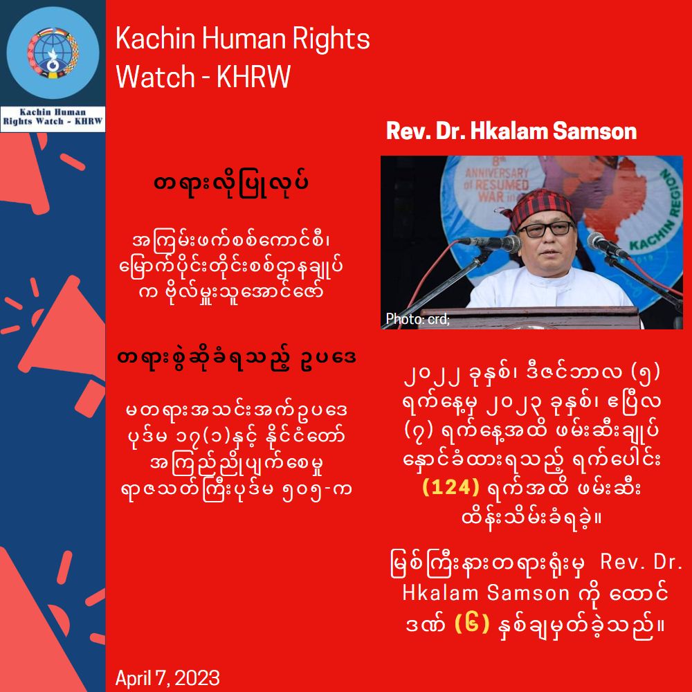 အကြမ်းဖက်စစ်ကောင်စီ၊ မြောက်ပိုင်းတိုင်းစစ်ဌာနချုပ်က ဗိုလ်မှူးသူအောင်ဇော်ကနေ တရားလိုပြုလုပ်ပြီး မတရားအသင်းအက်ဥပဒေပုဒ်မ ၁၇(၁)နှင့် နိုင်ငံတော်အကြည်ညိုပျက်စေမှု ရာဇသတ်ကြီးပုဒ်မ ၅၀၅-ကနဲ့ တရားစွဲဆိုခဲ့ပြီး Rev. Dr. Hkalam Samson ကို ၂၀၂၂ ခုနှစ်၊ ဒီဇင်ဘာလ (၅) ရက်နေ့မှ ဖမ်းဆီးချုပ်နှောင်ခံထားရသည့် ရက်ပေါင်း (124) ရက်အထိ ဖမ်းဆီးထိန်းသိမ်းခံရပြီးနောက် ထောင်ဒဏ် (၆) နှစ် ချမှတ် ခဲ့ခြင်းဖြစ်သည်။