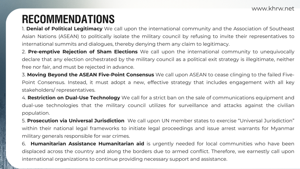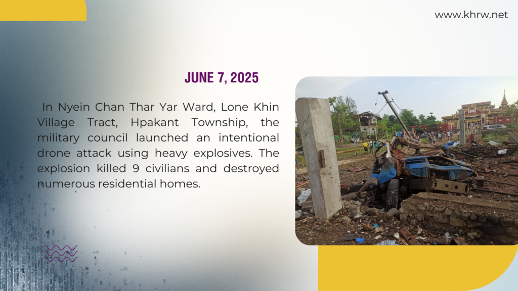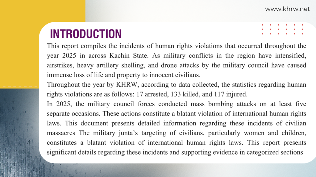 This report compiles the incidents of human rights violations that occurred throughout the year 2025 in across Kachin State. As military conflicts in the region have intensified, airstrikes, heavy artillery shelling, and drone attacks by the military council have caused immense loss of life and property to innocent civilians.