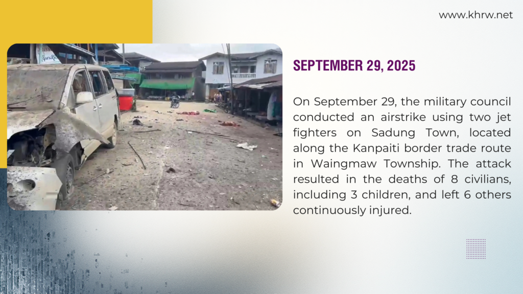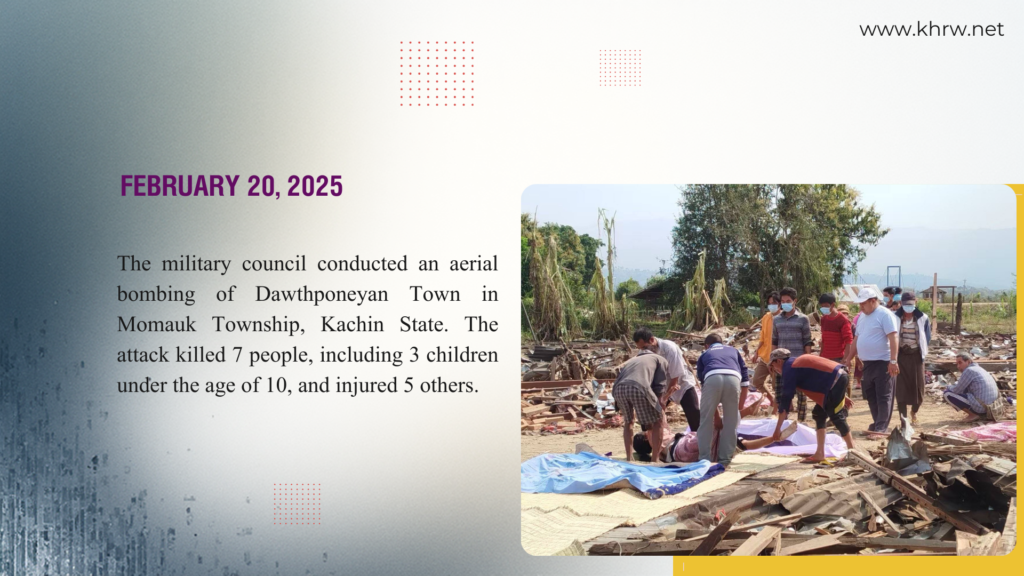 In 2025, the military council forces conducted mass bombing attacks on at least five separate occasions. These actions constitute a blatant violation of international human rights laws. This document presents detailed information regarding these incidents of civilian massacres. The military junta’s targeting of civilians, particularly women and children, constitutes a blatant violation of international human rights laws. This report presents significant details regarding these incidents and supporting evidence in categorized sections