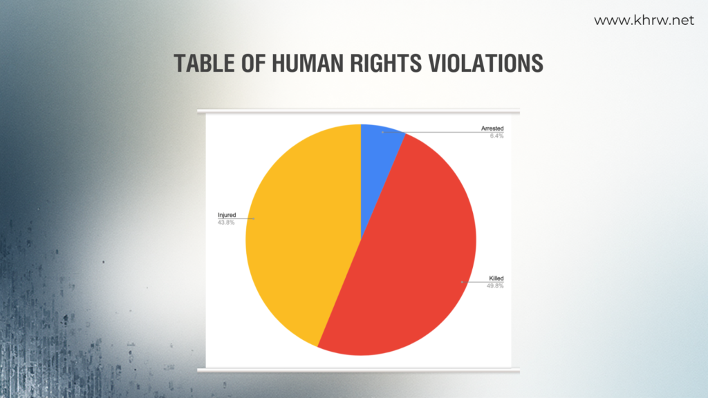 Throughout the year by KHRW, according to data collected, the statistics regarding human rights violations are as follows: 17 arrested, 133 killed, and 117 injured.