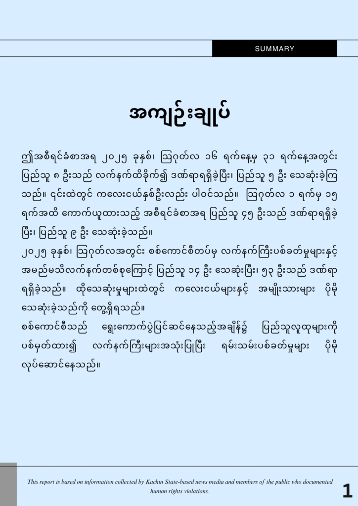 ဤအစီရင်ခံစာအရ ၂၀၂၅ ခုနှစ်၊ သြဂုတ်လ ၁၆ ရက်နေ့မှ ၃၁ ရက်နေ့အတွင်း ပြည်သူ ၈ ဦးသည် လက်နက်ထိခိုက်၍ ဒဏ်ရာရရှိခဲ့ပြီး၊ ပြည်သူ ၅ ဦး သေဆုံးခဲ့ကြသည်။ ၎င်းထဲတွင် ကလေးငယ်နှစ်ဦးလည်း ပါဝင်သည်။ သြဂုတ်လ ၁ ရက်မှ ၁၅ ရက်အထိ ကောက်ယူထားသည့် အစီရင်ခံစာအရ ပြည်သူ ၄၅ ဦးသည် ဒဏ်ရာရရှိခဲ့ပြီး၊ ပြည်သူ ၉ ဦး သေဆုံးခဲ့သည်။