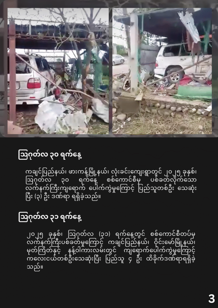 စစ်ကောင်စီသည် ရွေးကောက်ပွဲပြင်ဆင်နေသည့်အချိန်၌ ပြည်သူလူထုများကို ပစ်မှတ်ထား၍ လက်နက်ကြီးများအသုံးပြုပြီး ရမ်းသမ်းပစ်ခတ်မှုများ ပိုမို လုပ်ဆောင်နေသည်။
