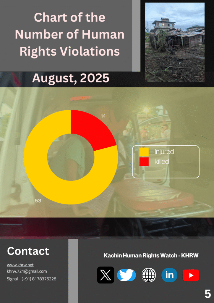 ၂၀၂၅ ခုနှစ်၊ သြဂုတ်လအတွင်း စစ်ကောင်စီတပ်မှ လက်နက်ကြီးပစ်ခတ်မှုများနှင့် အမည်မသိလက်နက်တစ်စုကြောင့် ပြည်သူ ၁၄ ဦး သေဆုံးပြီး၊ ၅၃ ဦးသည် ဒဏ်ရာရရှိခဲ့သည်။ ထိုသေဆုံးမှုများထဲတွင် ကလေးငယ်များနှင့် အမျိုးသားများ ပိုမိုသေဆုံးခဲ့သည်ကို တွေ့ရှိရသည်။