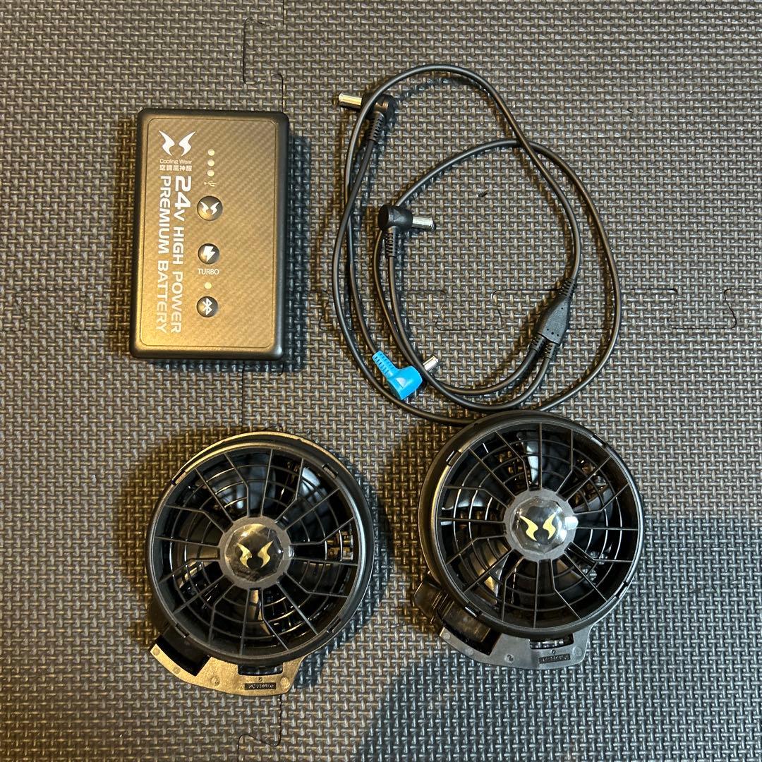 ゴールドのデザインが特徴的な空調服用ファンセット。- モデル名: AKZ-180KV- 色: ゴールド- 付属品: ファン2個、コントローラーご覧いただきありがとうございます。